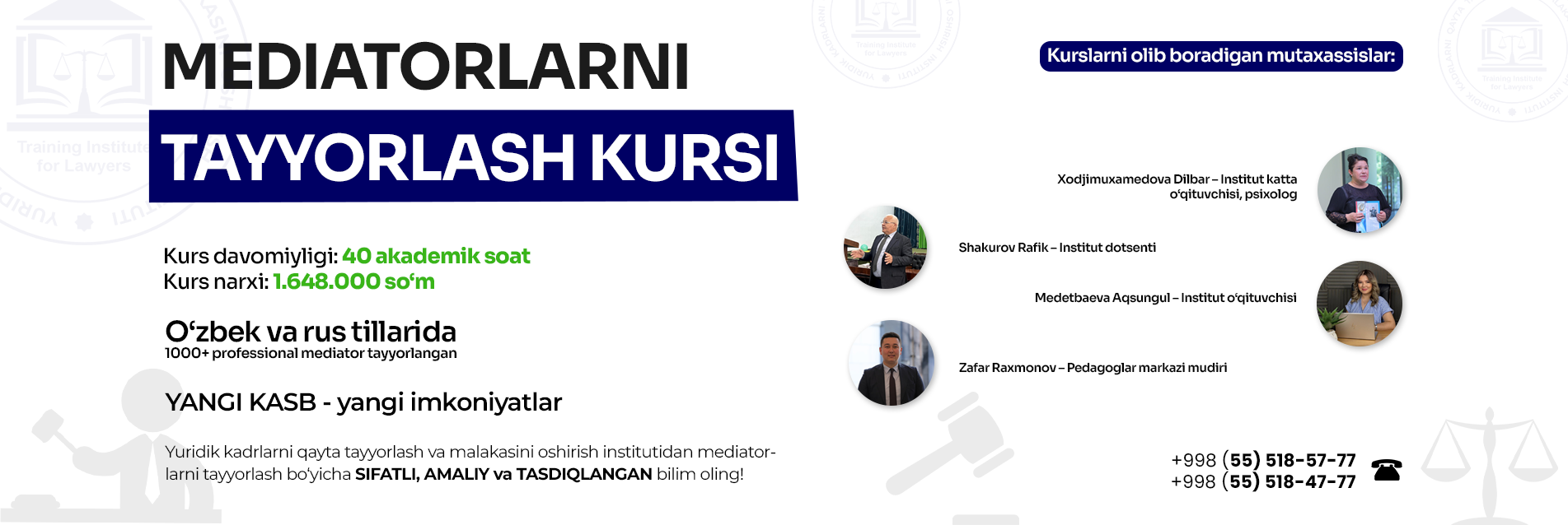Ўзбекистон Республикаси Президентининг “Маъмурий ислоҳотлар доирасида адлия органлари ва муассасаларининг масъулиятини янада ошириш ҳамда ихчам бошқарув тизимини шакллантириш тўғрисида” 2024-йил 24-майдаги ПФ-80-сон Фармони ижросини таъминлаш, шунингдек, адлия органлари ва муассасалари ходимлари, юридик хизмат, адвокатура, нотариат, медиация, интеллектуал мулк, суд экспертизаси, архив иши ва иш юритиш ҳамда бошқа соҳа мутахассисларини узлуксиз касбий ривожлантиришнинг замонавий тизимини йўлга қўйиш ҳамда уларни ўқитишни халқаро тажриба ва замонавий таълим стандартлари талабларидан келиб чиққан ҳолда такомиллаштириш мақсадида Ўзбекистон Республикаси Вазирлар Маҳкамасининг Ўзбекистон Республикаси Адлия вазирлиги ҳузуридаги Юридик кадрларни қайта тайёрлаш ва малакасини ошириш институти фаолиятини ташкил этиш чора-тадбирлари тўғрисида171-сон қарори билан ташкил этилган. ...