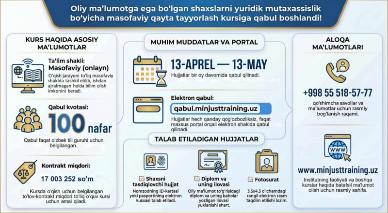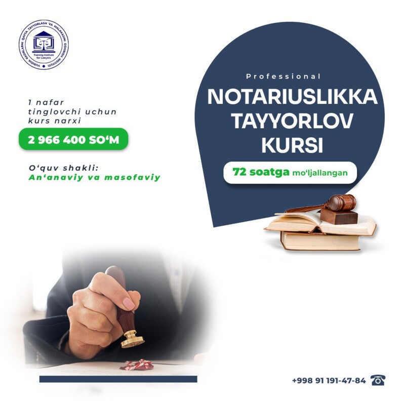 Ўзбекистон Республикаси Президентининг “Маъмурий ислоҳотлар доирасида адлия органлари ва муассасаларининг масъулиятини янада ошириш ҳамда ихчам бошқарув тизимини шакллантириш тўғрисида” 2024-йил 24-майдаги ПФ-80-сон Фармони ижросини таъминлаш, шунингдек, адлия органлари ва муассасалари ходимлари, юридик хизмат, адвокатура, нотариат, медиация, интеллектуал мулк, суд экспертизаси, архив иши ва иш юритиш ҳамда бошқа соҳа мутахассисларини узлуксиз касбий ривожлантиришнинг замонавий тизимини йўлга қўйиш ҳамда уларни ўқитишни халқаро тажриба ва замонавий таълим стандартлари талабларидан келиб чиққан ҳолда такомиллаштириш мақсадида Ўзбекистон Республикаси Вазирлар Маҳкамасининг Ўзбекистон Республикаси Адлия вазирлиги ҳузуридаги Юридик кадрларни қайта тайёрлаш ва малакасини ошириш институти фаолиятини ташкил этиш чора-тадбирлари тўғрисида171-сон қарори билан ташкил этилган. ...