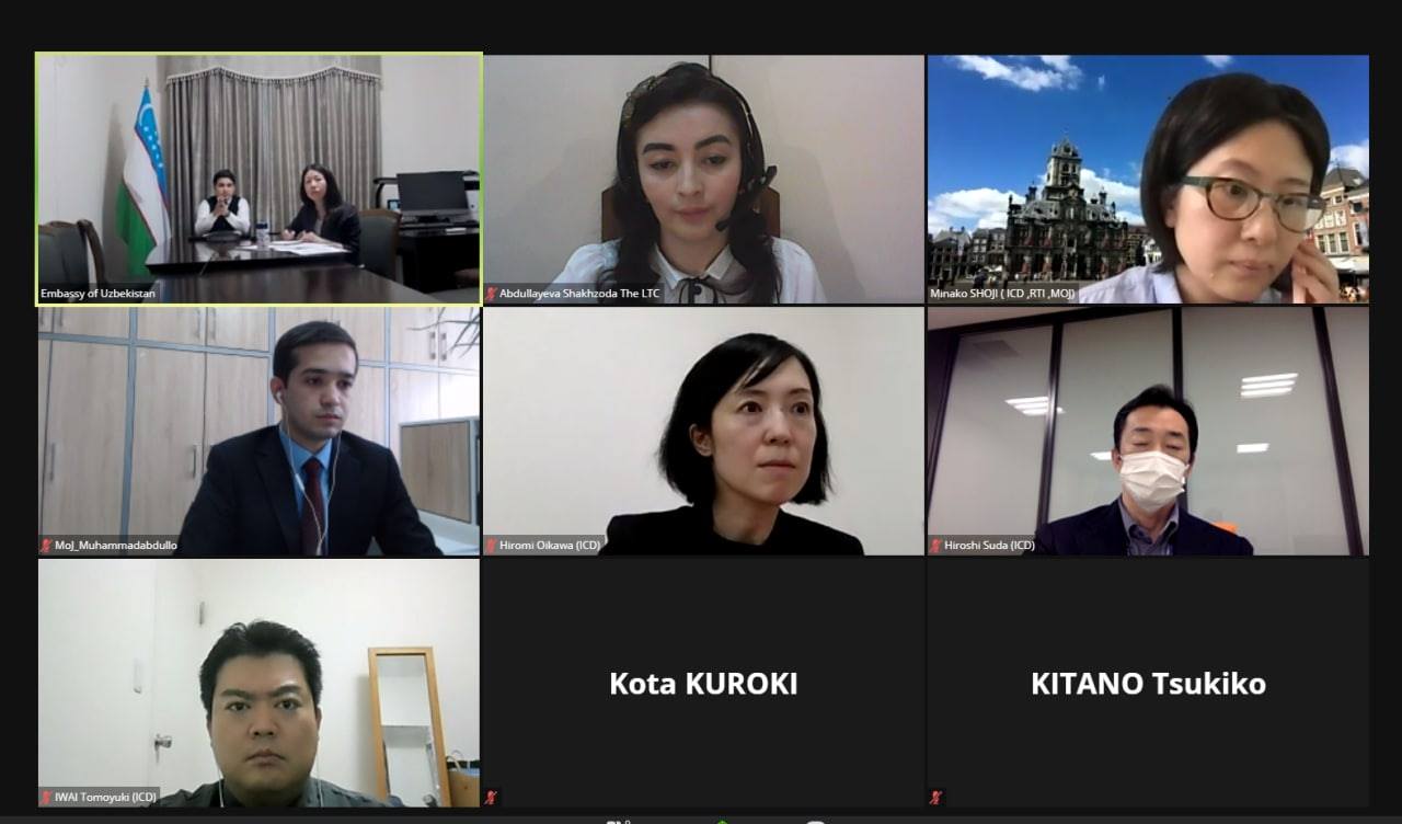 Ўзбекистон Республикаси Адлия вазирлиги ҳамда Ташқи ишлар вазирлиги кўмагида Юристлар малакасини ошириш маркази ва Япония Адлия вазирлиги ҳузуридаги илмий-тадқиқот институти ўртасида онлайн музокаралар бўлиб ўтди.