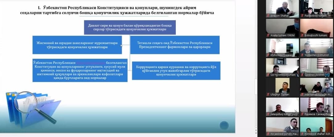 Bugun Yuristlar malakasini oshirish markazining malakali professor-oʻqituvchilari tomonidan Andijon viloyati adliya boshqarmasi huzuridagi yuridik xizmat ko‘rsatish markazi xodimlari uchun masofaviy (onlayn) shaklda oʻquv kurslari boʻlib oʻtmoqda.