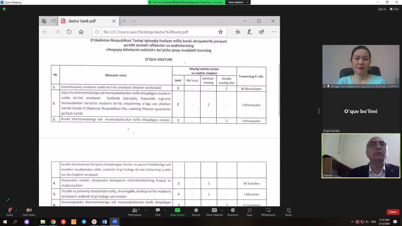 Joriy yilning 12-fevral kuni Yuristlar malakasini oshirish markazining Oʻquv jarayonini tashkil etish va nazorat qilish boʻlimi, Fan, innovatsiya va taʼlim dasturlarini ishlab chiqish boʻlimi va “O‘zbekiston Respublikasi Tashqi iqtisodiy faoliyat milliy banki” AJ Yuridik departmenti bilan hamkorlikda amaliy onlayn seminar boʻlib oʻtdi.