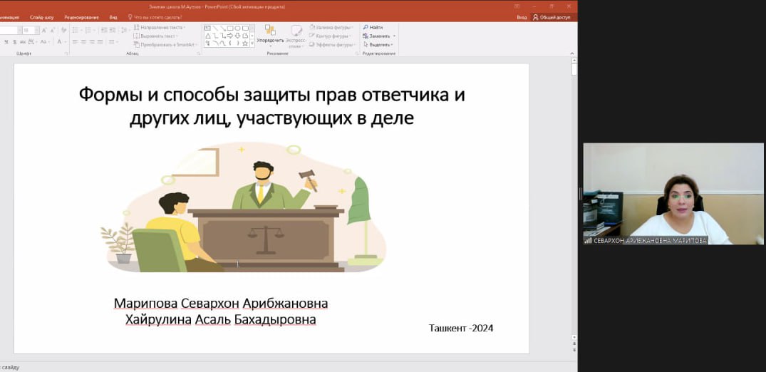 Ayni damda M. Auezov nomidagi Janubiy Qozogʻiston davlat universiteti tomonidan tashkil etilgan “Globallashuv sharoitida inson huquqlarini himoya qilish: nazariy muammolar va amaliy yechimlar” mavzusidagi Xalqaro onlayn qishki maktab 2024 da Yuristlar malakasini oshirish markazi kafedra mudiri S.Maripova "Sudlanuvchi va ishda ishtirok etuvchi boshqa shaxslarning huquqlarini himoya qilish shakllari va usullari" nomli ma'ruzasi bilan ishtirok etmoqda