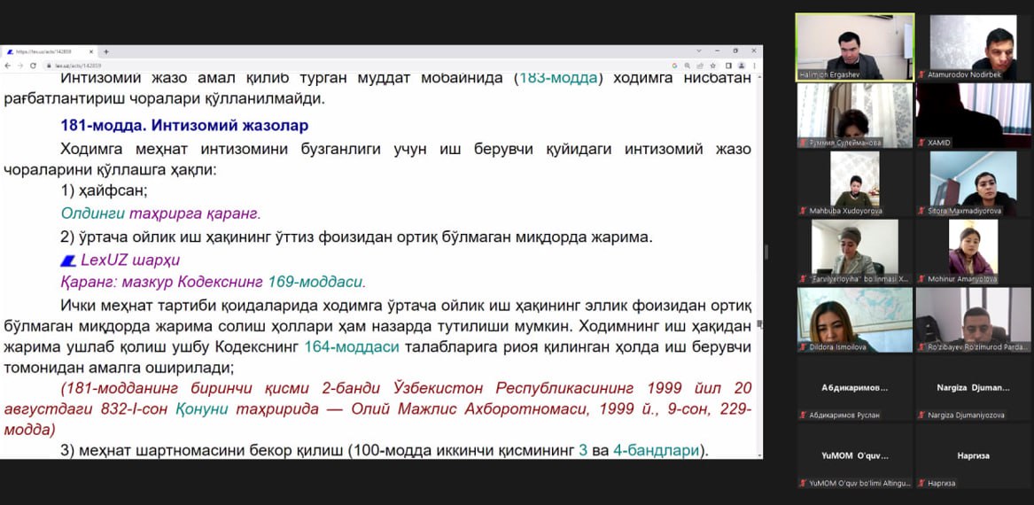 Joriy yilning 10-yanvar kunidan boshlab  “Oʻzdaverloyiha” davlat ilmiy loyihalash instituti va uning hududiy boʻlinmalari xodimlari  bilan “HR menejmenti. Mehnat qonunchiligi va mehnat munosabatlari”  boʻyicha onlayn oʻquv kurslarimiz boshlandi.