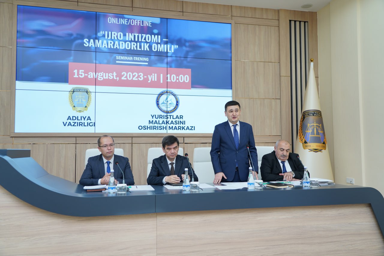 Joriy yilning 15-avgust kuni Oʻzbekiston Respublikasi Adliya vazirligi hamda Yuristlar malakasini oshirish markazi bilan hamkorlikda “IJRO INTIZOMI – SAMARADORLIK OMILI” mavzusida seminar-trening tashkil etildi. Tadbirda Respublikamizning 50 dan ortiq vazirlik, idora va tashkilotlari, oliy taʼlim muassasalari, ommaviy axborot vositalari vakillari, shuningdek Yuristlar malakasini oshirish markazi professor-oʻqituvchilari va xodimlari ishtirok etdilar.