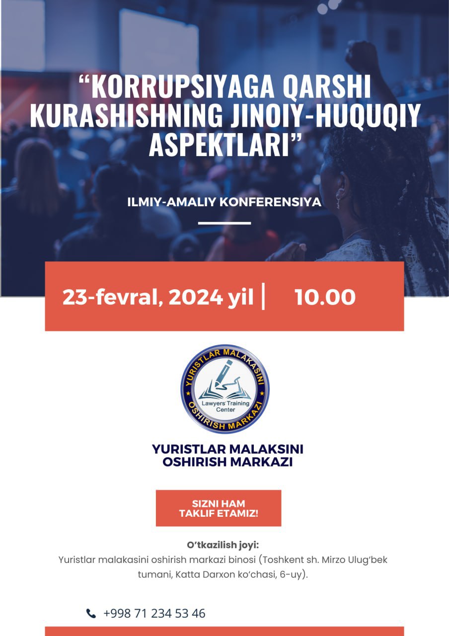 Yuristlar malakasini oshirish markazi tomonidan 2024-yil 23-fevral kuni kuni soat 10.00 da Markaz binosida “KORRUPSIYAGA QARSHI KURASHISHNING  JINOIY-HUQUQIY ASPEKTLARI”