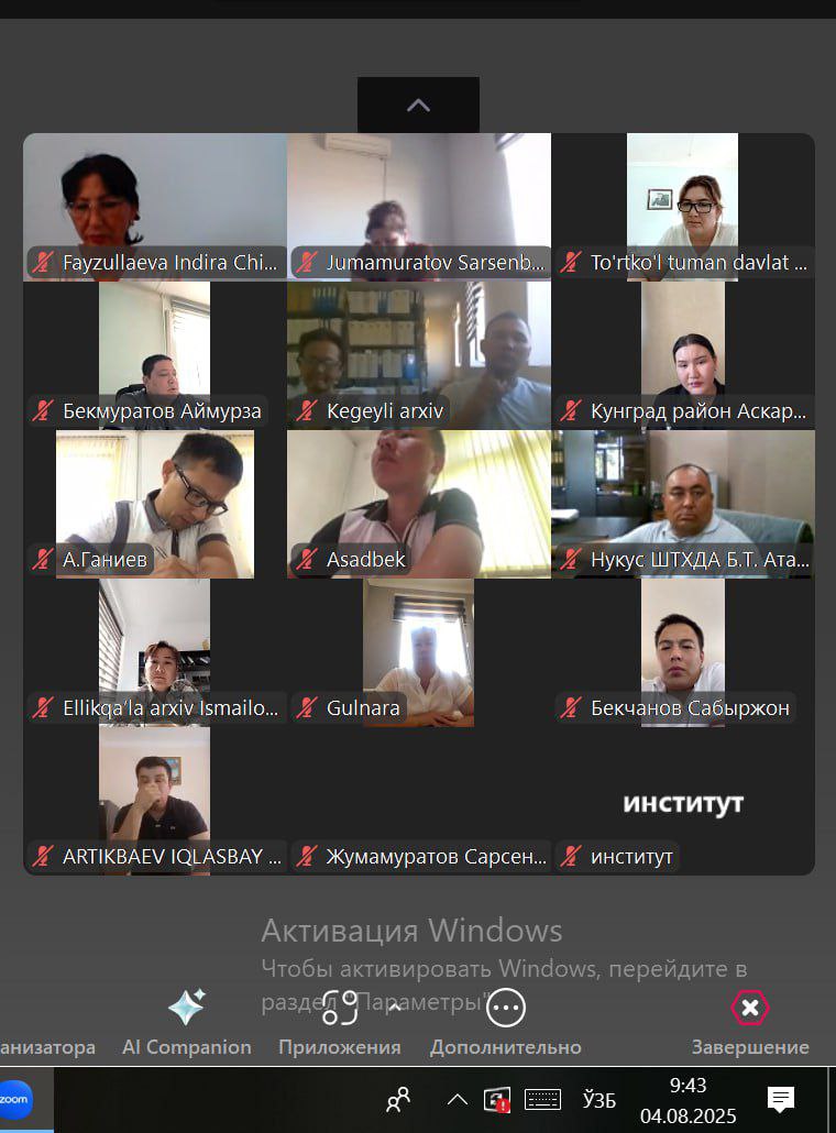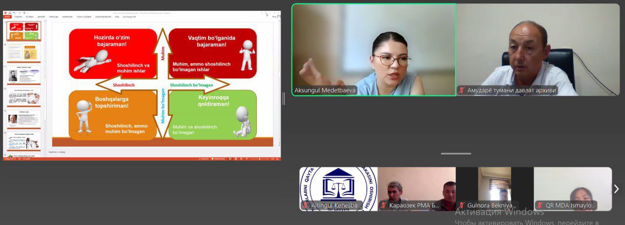 Institutimizda malaka oshirayotgan Qoraqalpog‘iston Respublikasi Arxiv ishi hududiy boshqarmasi va uning tizimidagi tuman davlat arxivlarining arxiv ishi sohasiga mas’ul xodimlari uchun "Ish vaqtidan unumli foydalanish va vaqtni boshqarish (“taym-menedjment”) qoidalari" mavzusida Institutimiz o'qituvchisi A.Medetbayeva tomonidan o'quv mashg‘uloti o‘tkazildi.