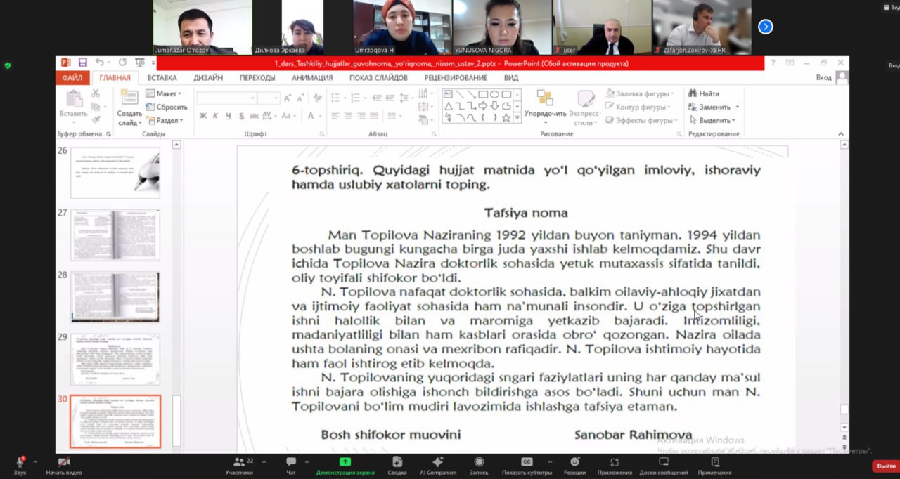 Dars mashg'ulotlari davomida Adliya vazirligi Idoraviy normativ- huquqiy hujjatlarni davlat ro’yxatidan o’tkazish boshqarmasi, Toshkent davlat yuridik universiteti mutaxassislari va boshqa amaliyotchilar tomonidan turli xil xat-hujjatlarning tasnifi va xususiyatlari, rasmiy hujjatlarni tayyorlash va rasmiylashtirishga qo‘yiladigan zamonaviy talablar, ish xatlarini muvofiqlashtirish (ko‘rish) va imzolash qoidalari yuzasidan tushuntirishlar berildi.