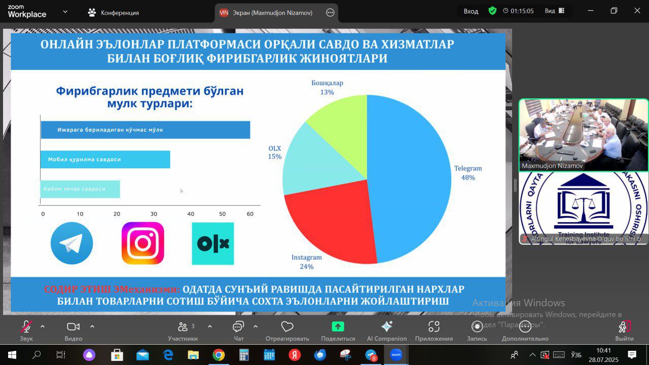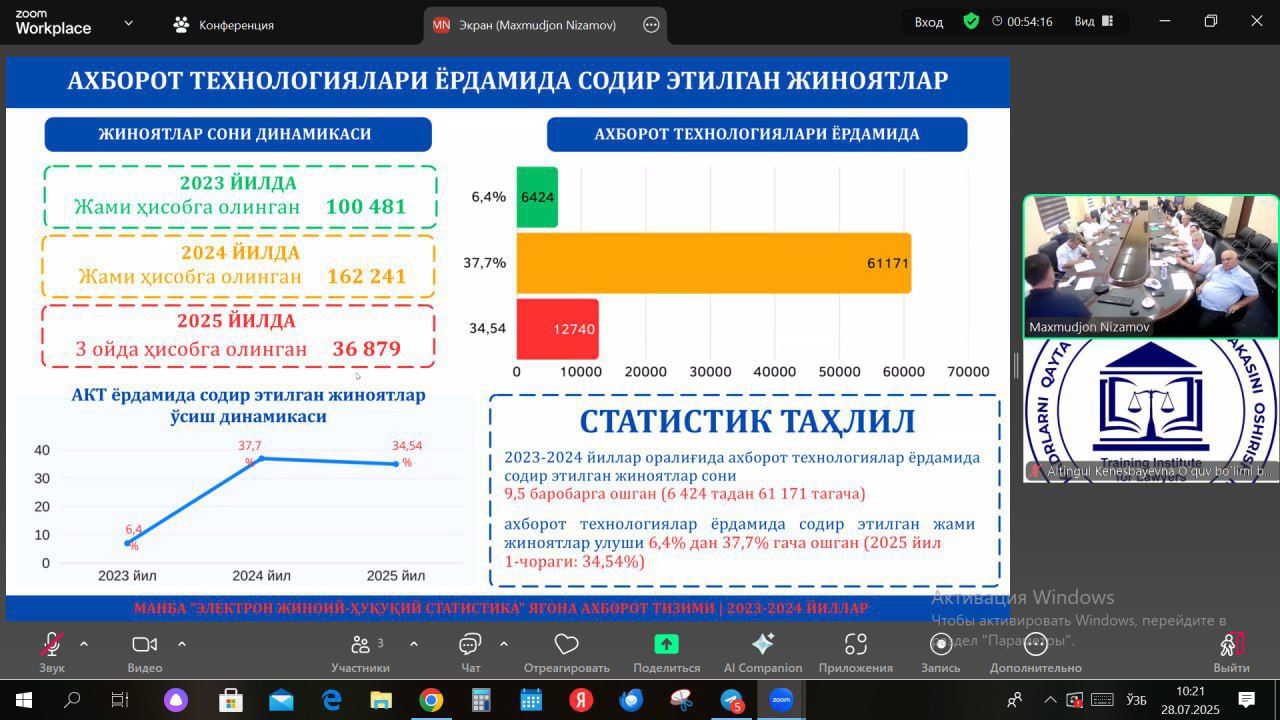 "Kiberjinoyatlarni  oldini olish va fosh etishning o'ziga xos jihatlari, amaliyatdagi muammolar" mavzusida O‘zbekiston Respublikasi Bosh prokuratura HMQO akademiyasi Raqamli kriminalistika ilmiy-tadqiqot instituti boshlig‘i G.Musayev tomonidan amaliyot mashg‘uloti o‘tkazildi.
