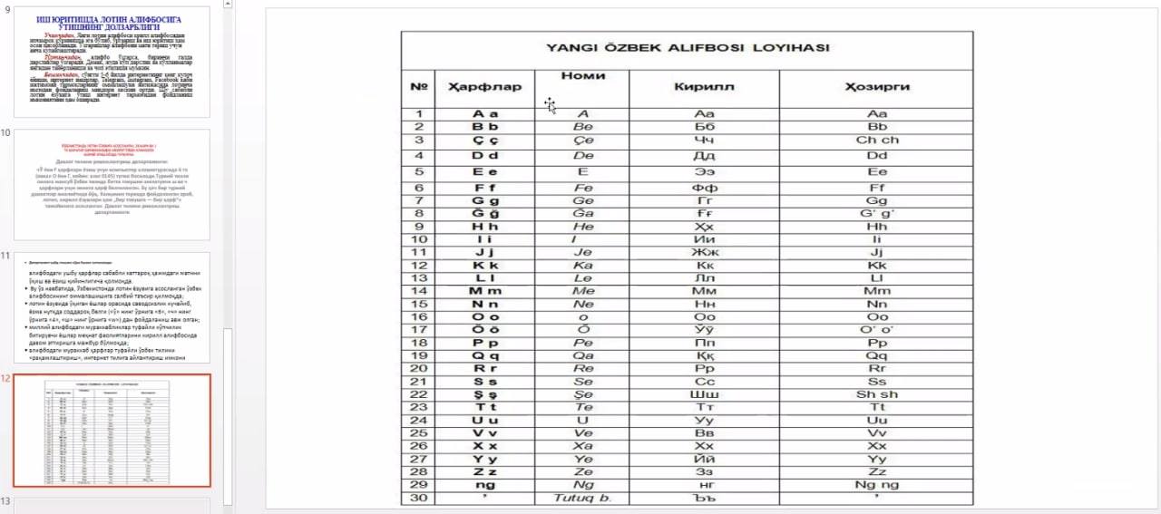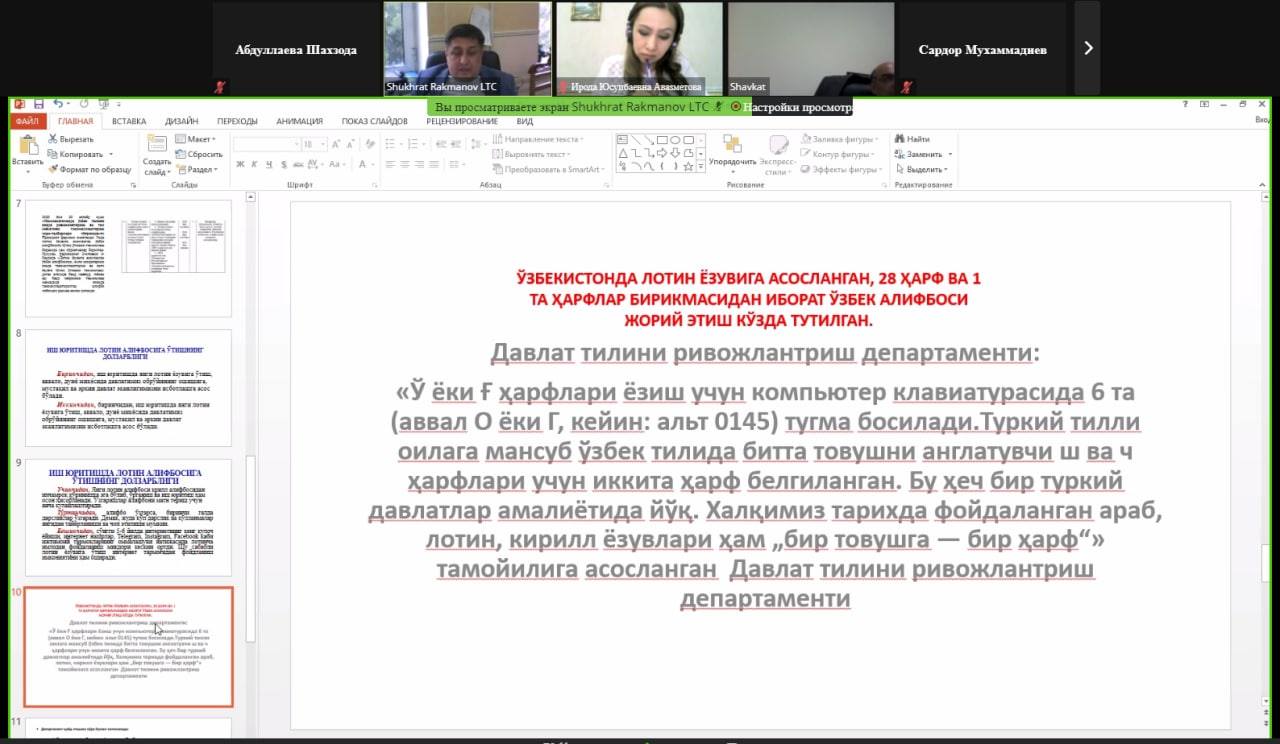 O‘zbekiston Respublikasi adliya vaziri tomonidan 2021-yil 12-yanvarda tasdiqlangan ish-rejasi asosida Adliya organlari va muassasalarida ma’naviy-ma’rifiy ishlar samaradorligini oshirish, davlat tili to’g’risidagi qonun hujjatlariga rioya etilishini ta’minlash maqsadida markaz xodimlari uchun lotin alifbosini o‘rganish bo‘yicha o‘quv-mashg‘ulotlarining galdagi mavzusi “Lotin yozuviga asoslangan o‘zbek alifbosini joriy etish boyicha dastlabki loyihalar” bo’ldi.