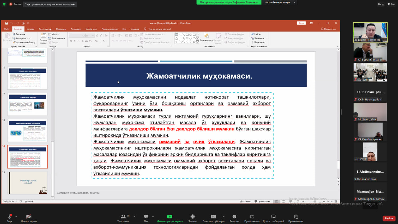 Joriy yilning 25-mart kuni Yuristlar malakasini oshirish markazi tomonidan Mahalliy Kengashlar deputatlari va kotibiyatlari xodimlari xodimlarining bilim va malakasini oshirishga qaratilgan tematik o‘quv kursi tashkil qilindi.