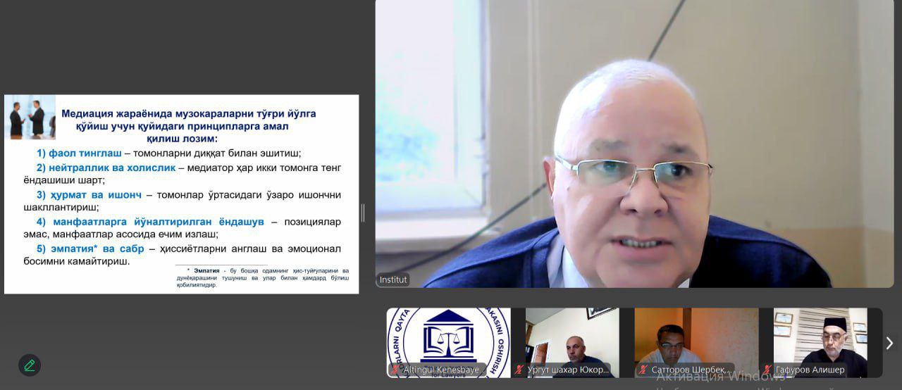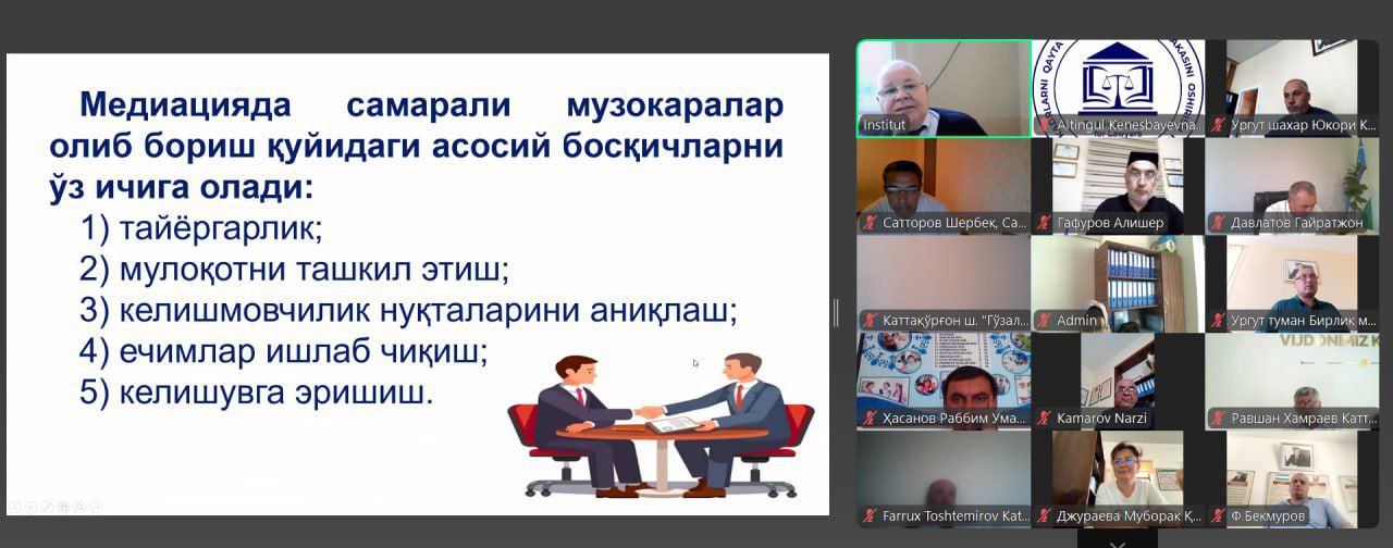 Institutimizda “Mediatorlarni tayyorlash” o‘quv kursida o'qitilayotgan Samarqand viloyati fuqarolarning o‘zini o‘zi boshqarish organlari raislari uchun "Mediatsiya jarayonining natijasi va u bilan bogʻliq hujjatlarni rasmiylashtirish" mavzusida Institutimiz o'qituvchisi R.Shakurov tomonidan o'quv mashg‘uloti o‘tkazildi.