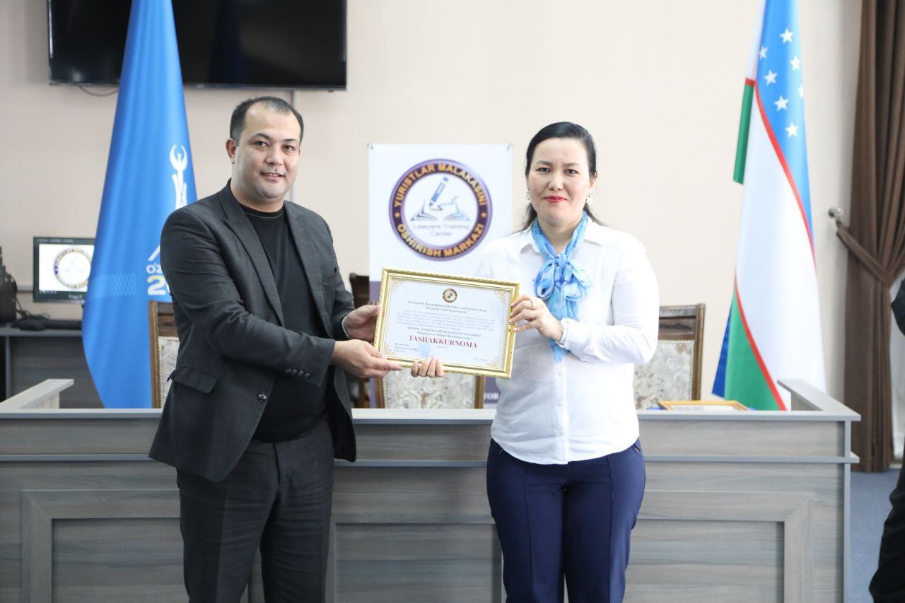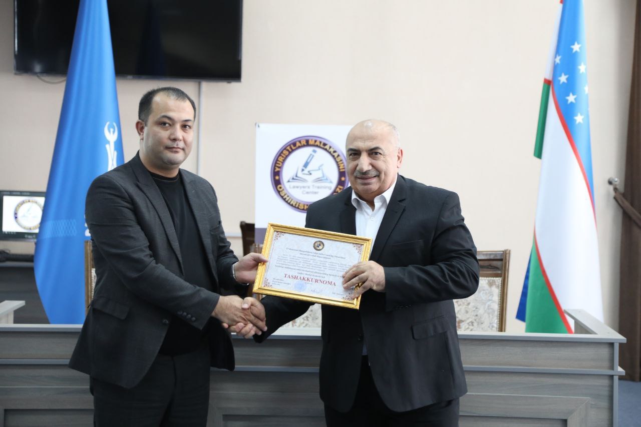 Jazoni ijro etish muassasalarida faoliyat yuritayotgan xodimlarning huquqiy ongi va huquqiy madaniyatini yuksaltirish, tizimli ravishda malakasini oshirib borish, Prezidentimiz tomonidan olib borilayotgan islohotlar hamda qonunlarni oʻz vaqtida va toʻgʻri ijro etilishida Jazoni ijro etish departamenti bilan samarali hamkorlik qilib kelayotganligi uchun Departament rahbariyati tomonidan Yuristlar malakasini oshirish markazi direktori Y.Kanyazov, direktorning birinchi oʻrinbosari Sh.Saidov va Markaz boʻlim boshligʻi A.Yusupbayevalar TASHAKKURNOMA va esdalik sovgʻalar bilan taqdirlandilar.