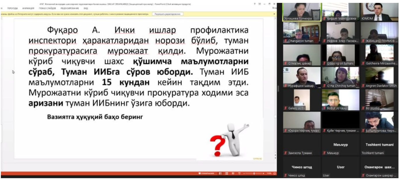 Toshkent viloyati hamda tuman (shahar) hokimliklarining murojaatlar bilan ishlashovchi xodimlari uchun "Davlat organlari va tashkilotlarining jismoniy va yuridik shaxslarning murojaatlari bilan ish olib boruvchi xodimlari malakasini oshirish" dasturi asosida tashkil qilingan onlayn oʻquv kurslarimiz boshlandi.
