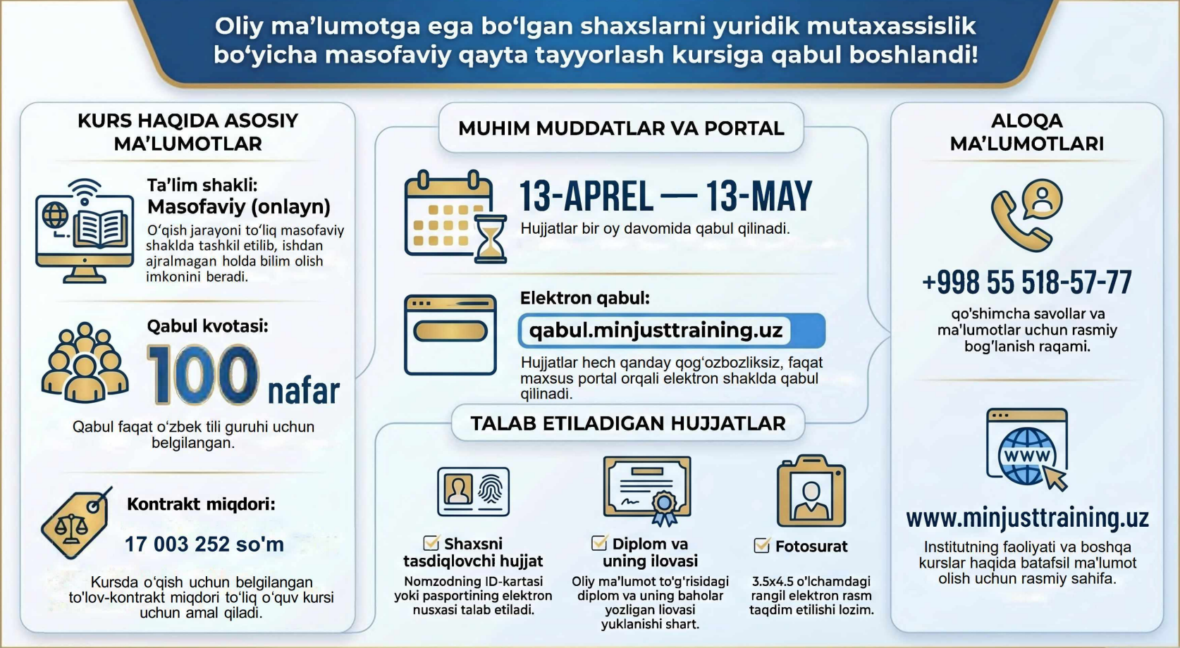Hujjatlarni qabul qilish 13-apreldan 13-mayga qadar (shu kuni ham) qabul.minjusttraining.uz sayti orqali amalga oshiriladi.
