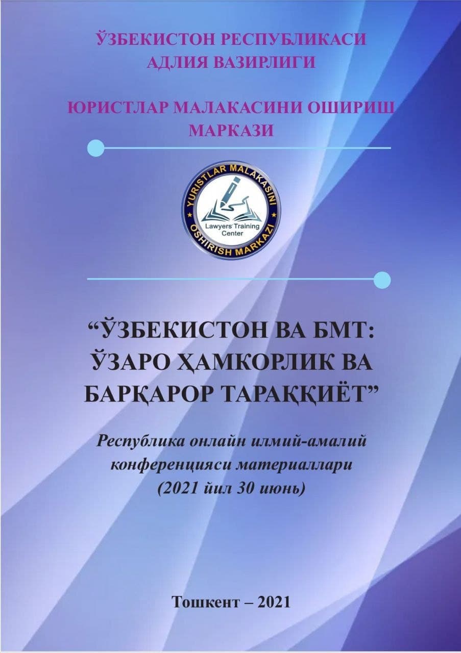 Mazkur toʻplam 2021-yil 30-iyun kuni Yuristlar malakasini oshirish markazida boʻlib oʻtgan “Oʻzbekiston va BMT: oʻzaro hamkorlik va barqaror taraqqiyot” mavzusida Oʻzbekiston Respublikasining BMTga aʼzo boʻlganligining 29 yilligiga bagʻishlangan respublika ilmiy-amaliy onlayn konferensiya materiallaridan iborat.