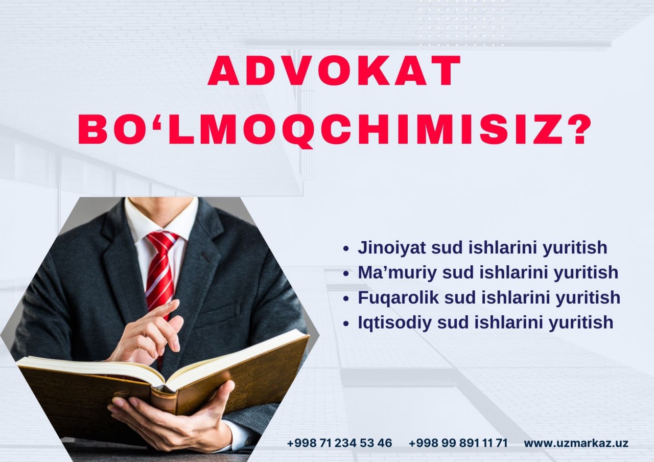 Yuristlar malakasini oshirish markazi "Advokatlikka tayyorlov" hamda "Advokatlikka nomzodlar uchun birlamchi ixtisoslashuv" o‘quv kurslarini taklif etadi.