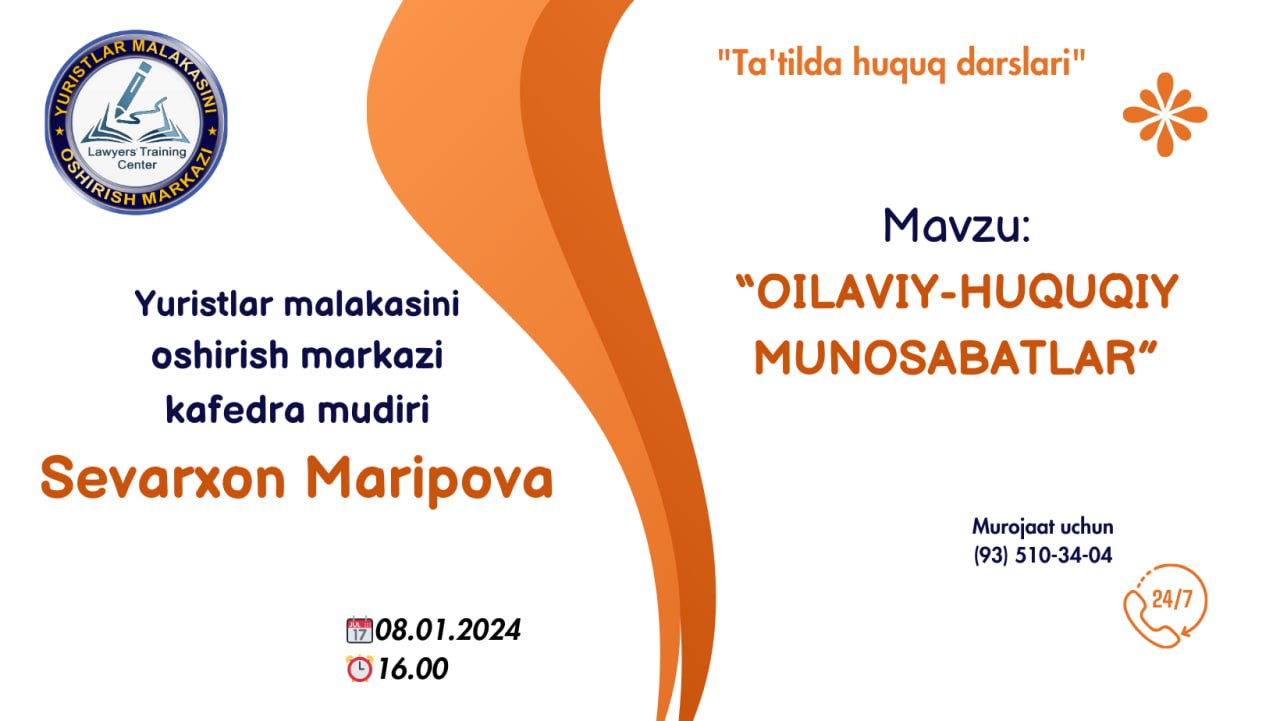 Navbatdagi dars, "OILAVIY-HUQUQIY MUNOSABATLAR" mavzusida bo'lib o'tadi.