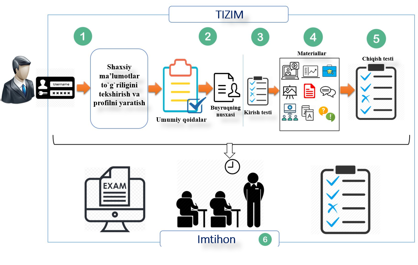 5-qadam. Berilgan muddatda barcha modullar o’zlashtirilib bo’lgandan so’ng chiqish testi topshiriladi.